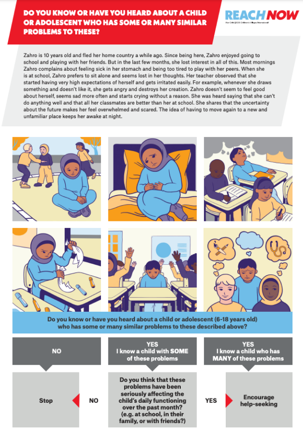 The ReachNow tool, developed by War Child Holland, aims to improve help-seeking among children and adolescents in need of mental healthcare by strengthening community-level proactive detection and help-seeking encouragement. The tool is made up of illustrated vignettes depicting most common, culturally relevant indicators of childhood psychological distress as well as decision-making diagrams, to guide community members and lay people towards seeking further support, if necessary.